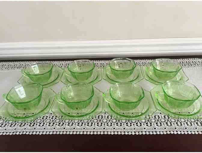 "Princess" pattern from Hocking Glass Company, set of 8 cups and saucers/dessert plates. Plates measure 5 1/2" in diameter. Excellent condition - no scratches, chips, or wear of any kind.