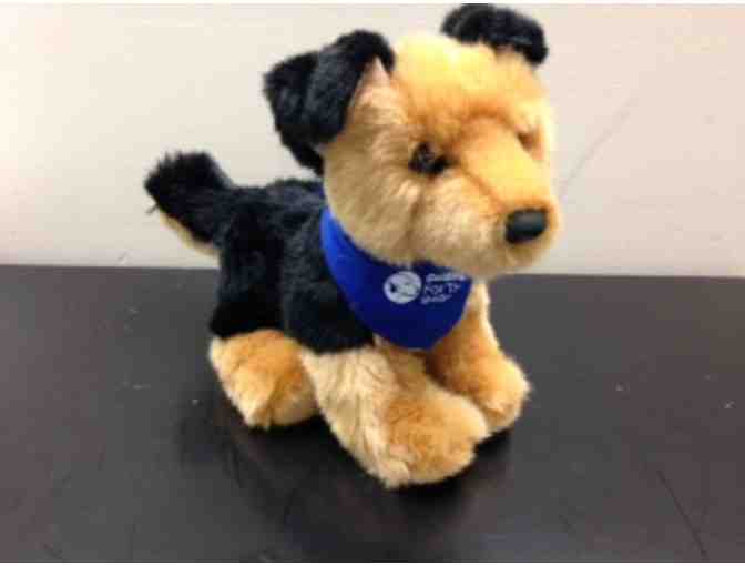 This 12" German shepherd is considered our puppy in training, as it wears just its blue bandana. The bandana has the Guiding Eyes logo and website address. A great gift to give - while showing your support for Guiding Eyes!