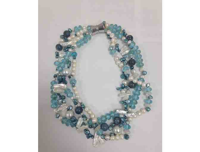 This three-strand necklace just screams BEACH! Hand-knotted on silk, the blue kyanite and the white of the freshwater pearls and rainbow moonstone simply shimmer. This is that piece you will put on again and again, May to September, Cape Cod to Key West.