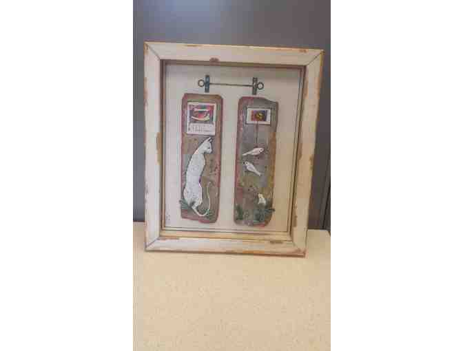 Win this beautiful one-of-a-kind piece by San Francisco artist Teilor R. Good. This piece includes two low relief tiles in an open, distressed shadow box. Teilor Good has been a practicing ceramic artist for twelve years. Her style is strongly influenced by Egyptian art and storybook illustration and can range from simplistic stylization to realistic depictions. Good received her B.F.A. in Ceramics from the California College of Arts and Crafts in 2003 and worked under the instruction of noted Ceramic artists such as Arthur Gonzalez, John Toki, Hedi Ernst and John De Fazio.