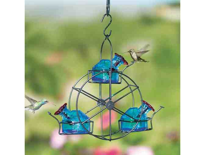 Bouquet Ferris Wheel Hummingbird Feeder is designed to enchant. Three feeding stations, each featuring a perch, allow multiple hummingbirds to feed at once. The feeding tubes in red glass are designed to mimic the trumpet vine, a hummingbird favorite. (Note: for safety reasons, the ferris wheel does not spin.) Measures 12" x 13" x 4". Includes a hanging hook. Instructions included. Recycled glass.