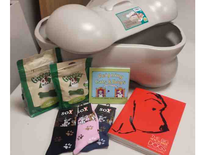 This fun gift is for you and your dog! This basket features: Dog bone toy storage box, "The Big New Yorker Book of Dogs," (3) pairs of dog-themed socks (for humans!), (2) bags of Greenies and a book entitled "Reigning Cats and Dogs." This package also includes a hand-made, reversible dog print apron "Woof!" and a handmade treat jar featuring a Scottie dog! You will look fabulous while making homemade dog treats. Also includes a handy Skunk Kit!