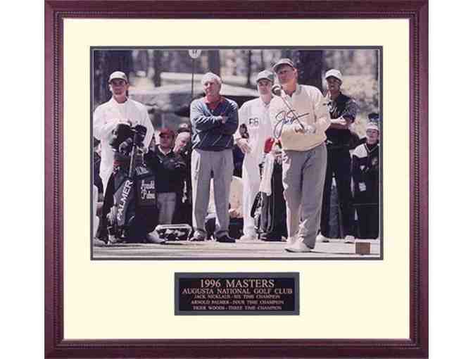Pictured here teeing off at the 1996 Masters with Tiger Woods and Arnold Palmer watching on. This 16x20 photo is hand signed by Jack Nicklaus and includes his personal "The Bear" hologram on the photograph. Professionally framed in a cherry wood frame with detailed nameplate. Size 28x30