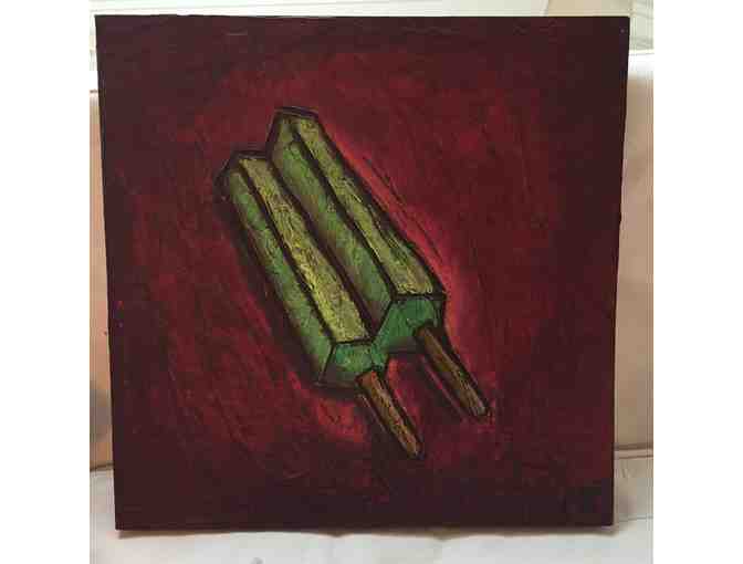 Margaret Teichert is a well-known Bay Area artist. A Popsicle. A Rubik’s Cube. A fortune cookie. The subjects of Margaret Teichert’s paintings are simple, almost childlike. She calls them “meditations on objects that make me happy.” Bid on this original 20"x20" painting of a Twin Popsicle.