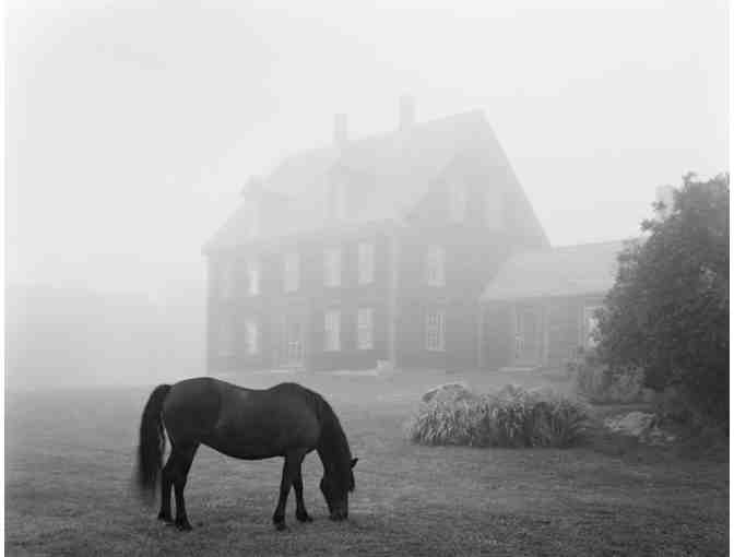 This amazing monochromatic photograph depicts a gentle pasture with a single horse grazing. In the background is a barn shrouded in the early morning mist, evoking the memory of Wyeth-esque settings. Dated and signed and donated by Ron Rosenstock, a sought after photographer.