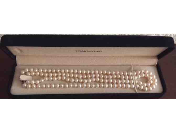 Double strand matched culture pearls. Hand knotted, with safety clasp.