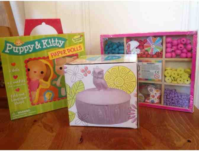 This gift bundle contains Puppy and Kitty Paper Dolls (with 2 dolls, 42 outfits plus accessories, fold-out boutique shops, reusable cling stickers), a Just for Fun Bead Box Kit, and a Porcelain Woodland Keepsake Box topped with an owl, for all her special treasures.