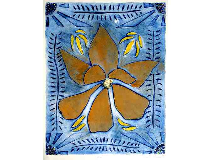 Lambertville artist Caroline Armstrong has created a richly colored collagraph using oil-based ink. 16" x 20" framed.