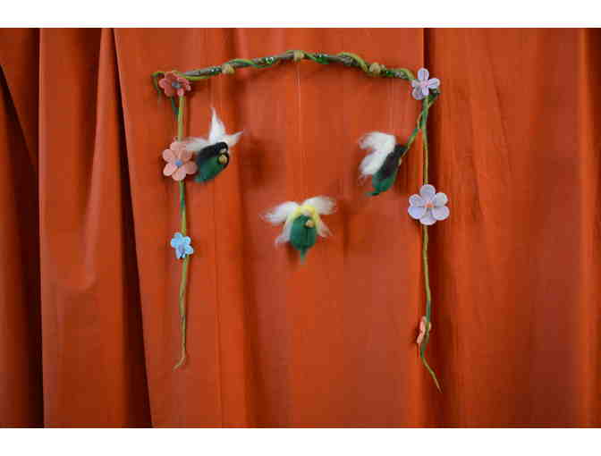 The children in Early Childhood Extended Care created this enchanting mobile with felted fairies and flowers hanging from a natural branch.
