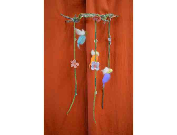 The children in Early Childhood Extended Care created this enchanting mobile with festive felted fairies and flowers hanging from a natural branch.