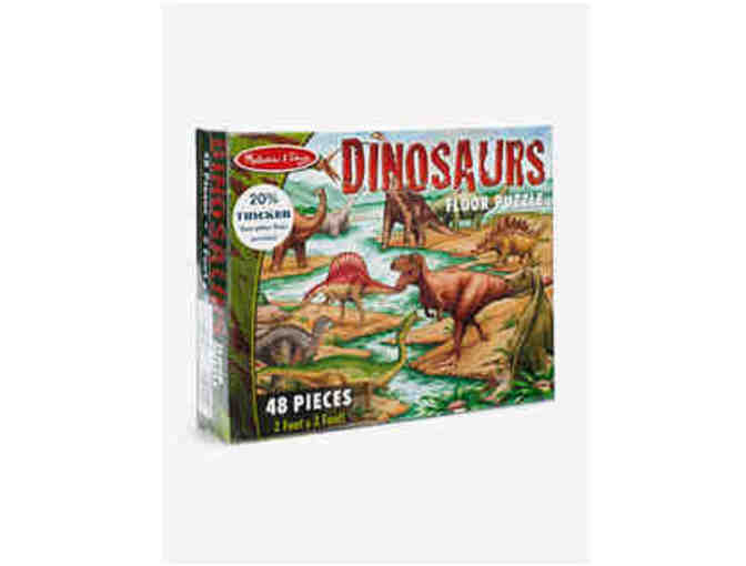 Dinosaurs Floor Puzzle by Melissa & Doug Interest in dinosaurs will never become extinct! Meet some favorites while completing this colorful cardboard puzzle. 2' x 3' when assembled, the 48 extra-thick pieces feature an easy-clean surface to keep this exciting puzzle looking like new.