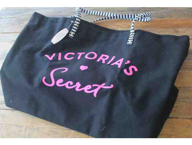 Victoria's Secret beach-sized tote bag. Black with pink 'Victoria's Secret' logo & fashionable striped handles. Fully lined with water-resistant lining.