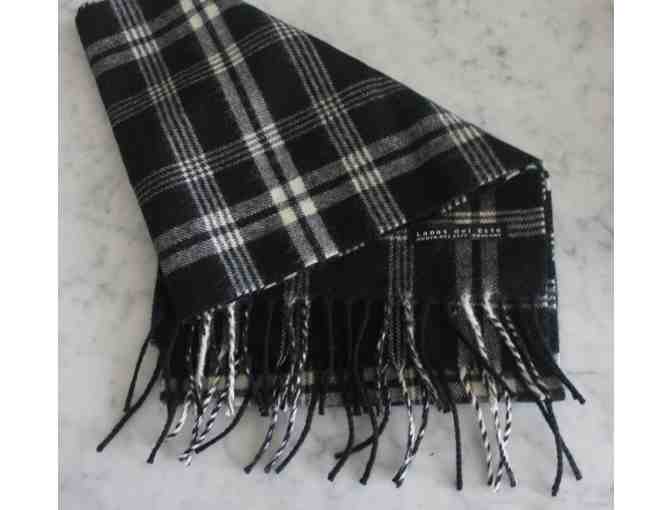 100% wool scarf from Uruguay in black and white plaid measuring 10" x 62".