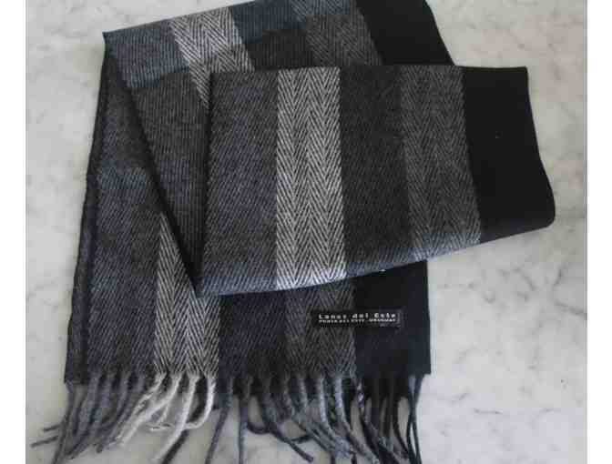 100% wool scarf from Uruguay in black and grey herringbone pattern measuring 10" by 62".