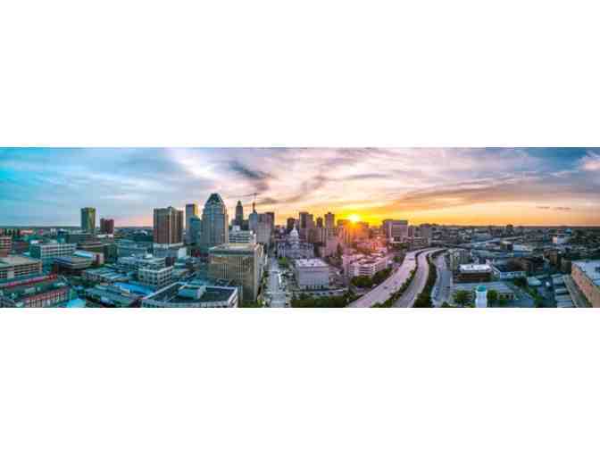 Stunning sunset of Baltimore, 4.5x18” framed print by Darin Hughes. Baltimore Skyline as viewed from the Phoenix Shot Tower.