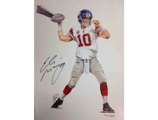 A one-of-a-kind sketch by caricaturist John Pennisi. Sketch number 25/100. Signed by Eli Manning at Guiding Eyes for the Blind's Golf Classic Sponsorship Recognition Party.