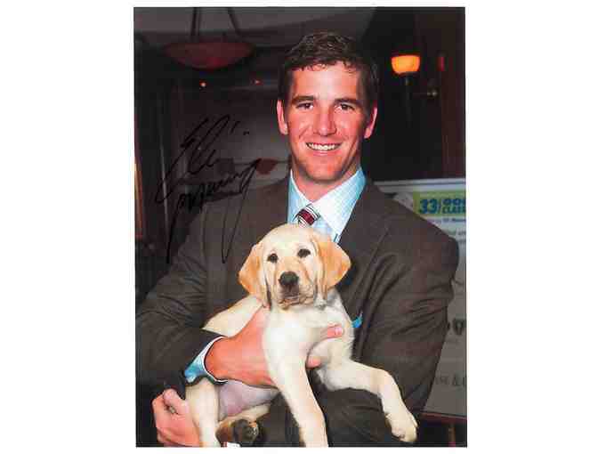 Autographed photograph of Eli Manning with an adorable Guiding Eyes puppy in a Guiding Eyes picture frame (8"x10").