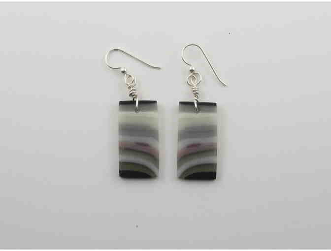 Hand crafted by Burlington artist, Cherie Marshall, these beautiful black, grey and white layered glass earrings measure approximately .5" wide by 1.125" long and have sterling silver ear wires.