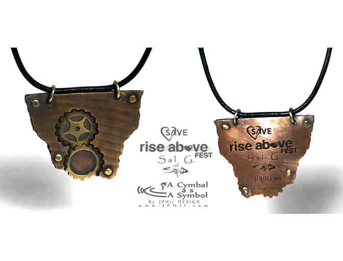 This piece is made out of a Zildjian ride cymbal donated by Sal G, the drummer of award-winning band Staind. It measures about 3inches by 2inches and features the etched logos of SAVE, Rise Above Fest, and Staind on the back. Hand-crafted using 100% recycled materials, this piece features a somewhat Steampunk aesthetic chosen by Sal G himself!