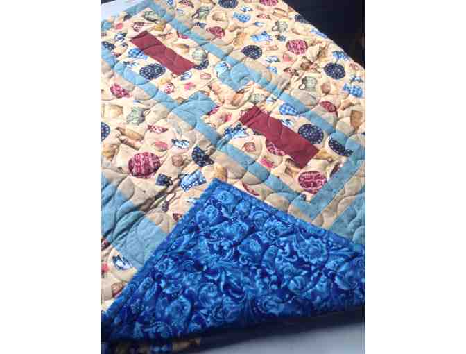 Covered in a cute and kitschy array of watering cans, teapots, cups, saucers, and mugs, this quilt would be an adorable addition to a kids room, a covered porch, or for a gardener or tea enthusiast! Handsewn by the women of WCCW.