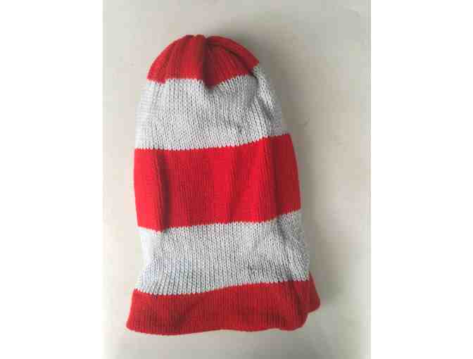 With this large, hand-knit, red and white striped hat you can easily be the Cat in the Hat for Halloween! Alternatively, play as Waldo from Where's Waldo. The hat is handknit by the women of the Washington Corrections Center for Women in Purdy, which partners with Freehold for the Engaged Theatre Residency program.