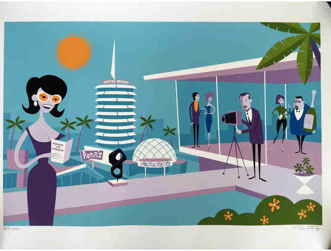 The “Modern Los Angeles” lithograph was done to commemorate the “20/20/20” Tour of Los Angeles, organized by the Modern Committee of the Los Angeles Conservancy.  The piece features “Shag-acatures” of notable taste-makers in Mid-Century Modernism and its preservation in Los Angeles, along with direct references of the Capitol Records Building, Cinerama Dome, and Pann’s Coffee Shop, all MCM architectural marvels.