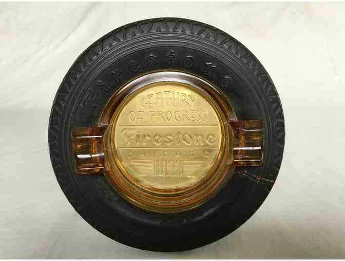 Collectable rubber-tire and amber glass ashtray features the words “Firestone” imprinted on the side-wall of the miniature rubber tire, while “Century of Progress – Firestone – Chicago – 1933” is embossed in the amber glass center. This was a promotional item produced by Firestone for their participation in “A Century of Progress International Exposition” World’s Fair in Chicago in 1933, which celebrated the city’s centennial.