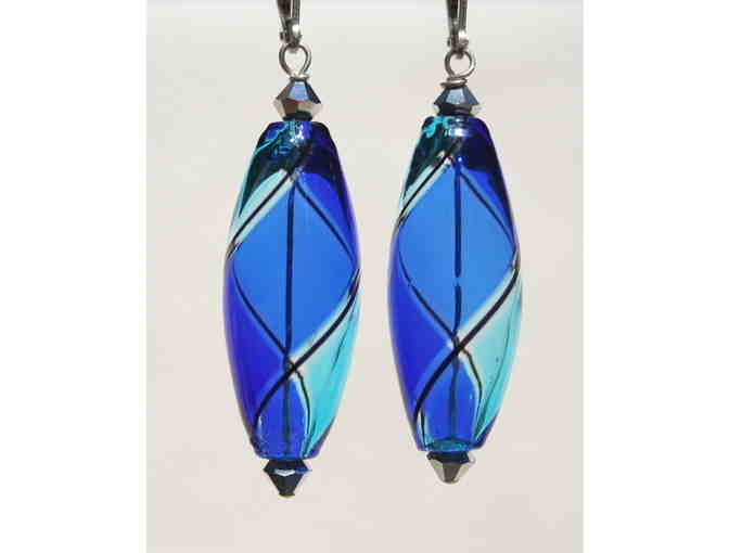 Increadibly light weight, these hollow "olive" shaped earrings combine brilliant aqua and cobalt colored glass with a thin black stripe. The beads are individually blown on the island of Murano, Italy where they have been making glass since the 12th century. The beads measure roughly 1 1/8" long by 3/8" wide and hang a little less than 2" from the earhole. Framed with Swarovski crystals. They fasten to the ear with the highest quality sterling silver lever-backs.
