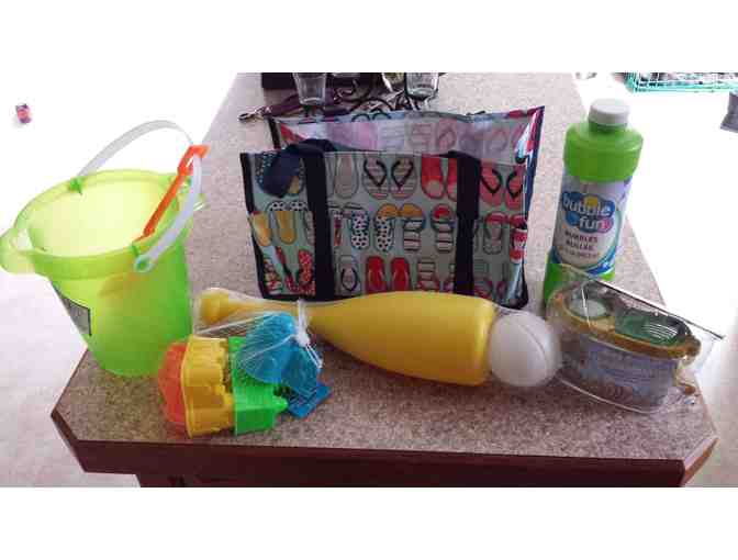 Thirty-One Flip Flop Utility Tote ready to hit the beach!  The tote has the following items in it......