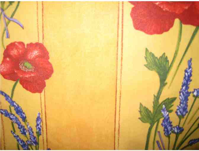 She offers this square coated tablecloth (58" by 58") from Provence. It has an acrylic coating on the cotton fabric which makes clean-ups quick and easy. No more worrying about spilled wine or tomato sauce! Just sponge it off and you are done!
