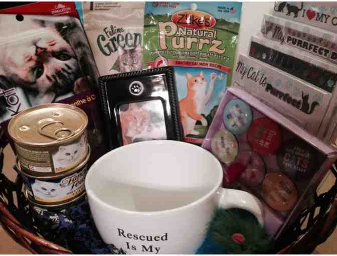 Cats rock, indeed! This meowtastic basket includes treats, canned food, catnip, a toy, fun kitty themed magnet, a coffee mug, picture frame, and pads of paper all with the theme "Rescued." Soothe your cat into a gentle calm with cat relaxation CD "Through a Cat's Ear" containing music scientifically-proven to calm your kitty.