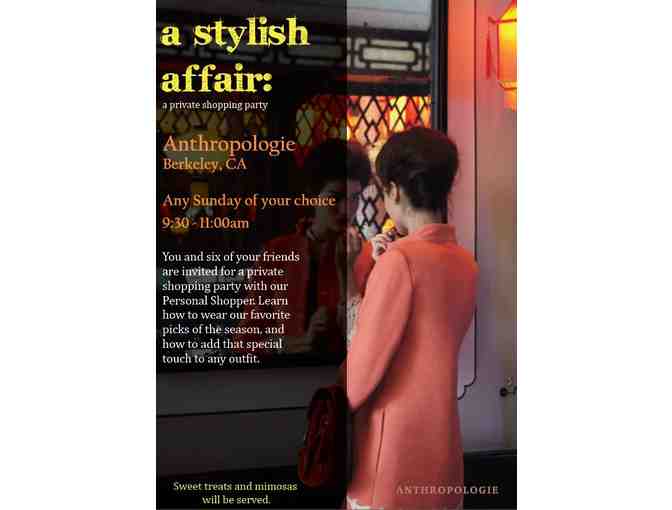 A personal shopping party for you and 6 friends at Anthropologie, Berkeley. The party will include breakfast snacks, mimosas, and one-on-one personal styling for all attendees!