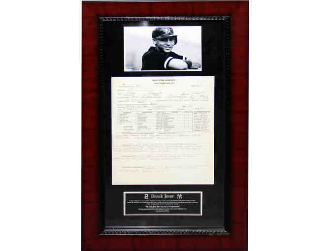 DEREK JETER 13X23 FRAMED SCOUTING REPORT COLLAGE WITH BLACK & WHITE PHOTO