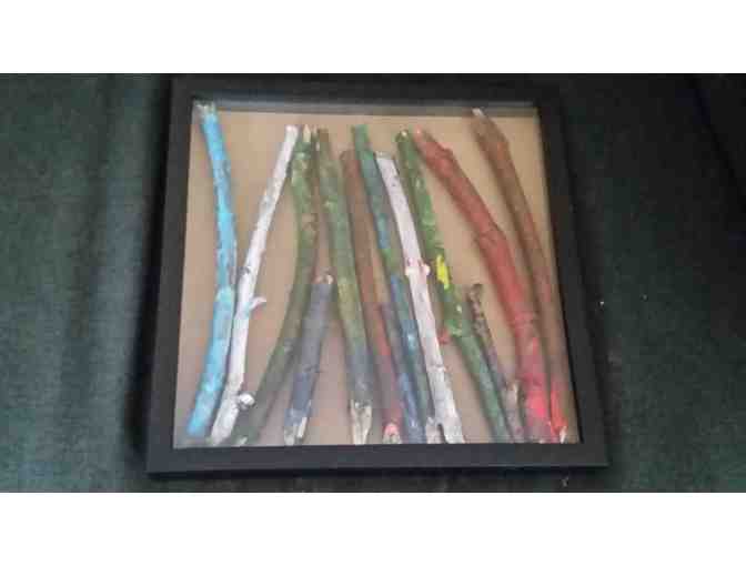 The Sea Pups created this lovely piece of artwork with sticks from the woods around Otter Creek, using tempra paint with paint brushes to cover them. Each child in the Sea Pup Room painted a stick!