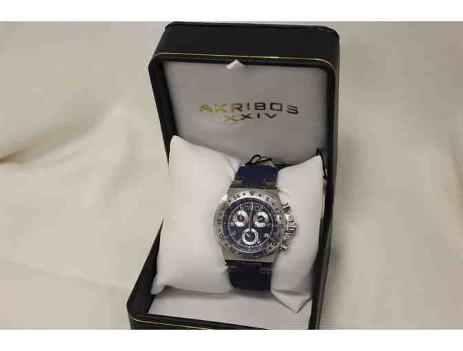 Ladies Akribos XXIV watch with denim band. Swiss quartz chronograph movement that includes 30 minute timer, dy and date display.