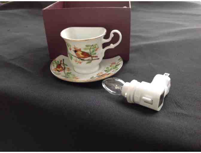 Italian designed Adeline night light featuring hand-painted three-quarter ceramic tea cup together with light. American wall plug.