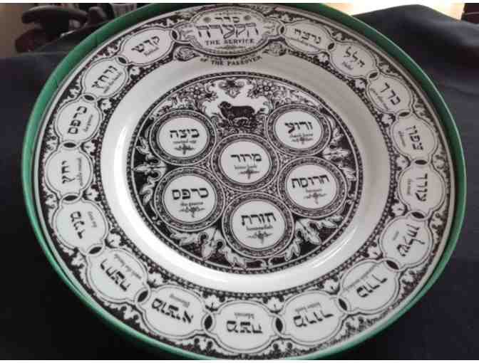 Black and white ceramic Seder Plate, replica of one created by Ridgways of London in 1920. Center sections are marked in Hebrew and English. Surrounding border lists the order of the Seder Service. Origin: Jewish Museum.