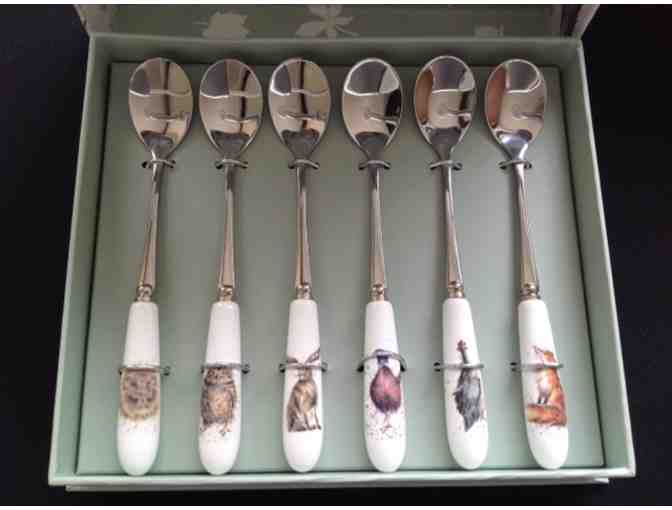The winning bidder receives the Royal Worcester set of 6 silver-plated teaspoons, each featuring a ceramic handle decorated with an animal in the style of Sir Christopher Wren. Offered in original box packaged and sold by Harrods of England.