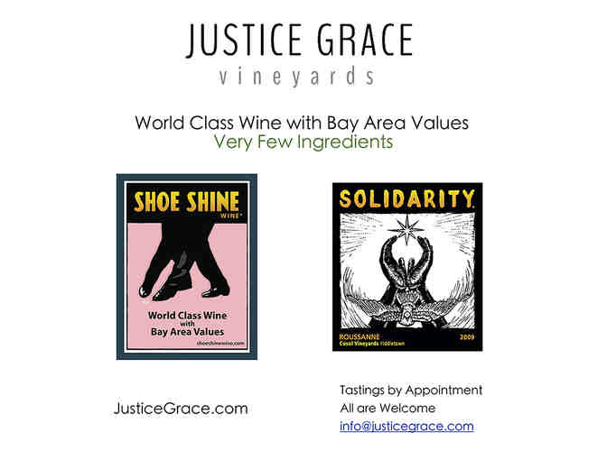 A behind-the-scenes look at the modern day wine industry, including a presentation on "Natural Wines", wine additives, and modern winemaking practices, and a fun blind tasting element. Several distinct, handcrafted wines tailor made by Justice Grace Vineyards".