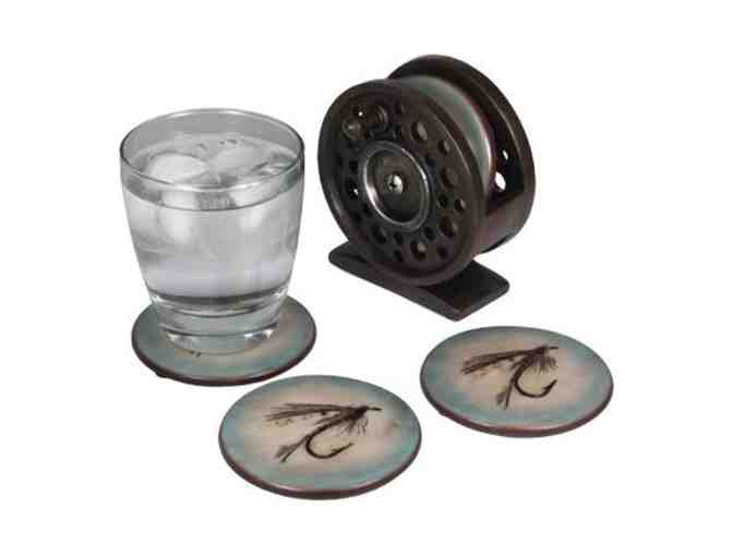 This hand-cast coaster set is perfect as a gift or for the avid angler’s home. Four coasters are held in a reel-shaped holder. Hand painted polyresin design.
