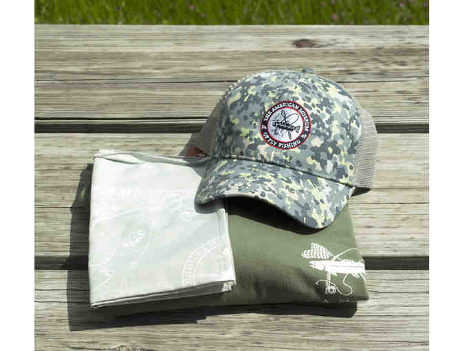 Show your support of AMFF by donning some of our latest gear. This package includes our new trucker hat in the tidal camo print, gray bandana, and olive t-shirt in size XL (other sizes may be available).