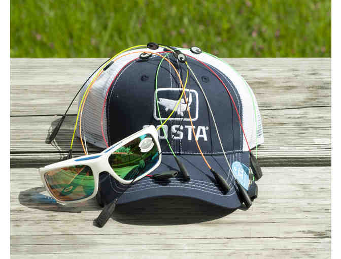 The Roosterfish is an elusive fish. And, to catch one on a fly, you best be prepared to see-and run-far. So when you're peering out into the water in pursuit, these durable sunglasses with their side-cupped frames will fight off the sun's glare to let you focus on fighting the fish. The Rooster has white frames with blue logo and blue mirror lenses. Complete the look with a Costa trucker hat and 6 Costa sunglass straps in black, gray, yellow, orange, red and green – almost a color for every day of the week!