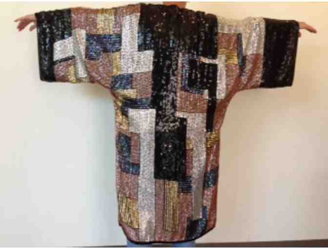The winning bidder will take home this striking hand-made, sequined, gender-neutral kimono. An art piece to hang (comes with bamboo display pole) or to wear to a remarkable occasion. Garment is entirely covered in vibrant sequins in earth tone color-block design. Really stunning.
