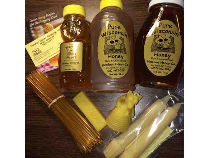 Enjoy a taste of Wisconsin with three jars of pure wisconsin honey, raw and unprocessed, from Hemken Honey Company. Also includes a bundle of 25 honey sticks, two beeswax candles, one bear and honey candle, and a bar of beeswax.