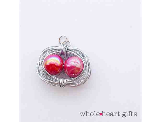 Wire wrapped nest pendant with two red colored bead "eggs". Would be a great gift for mothers and grandmothers.