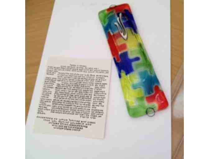 The winning bidder receives this stunning and unique rainbow fused class mezuzah "Putting all the pieces of the puzzle together." Includes a photocopy of BCC mezuzah scroll.