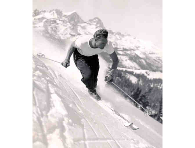 Dave McCoy, the founder of Mammoth Mountain Ski Area and the Mammoth Lakes Foundation, skiing Mammoth Mountain in 1955. This photo was taken by his friend Warren Miller, is printed on a 20x16 inch canvas and is signed by Dave McCoy.