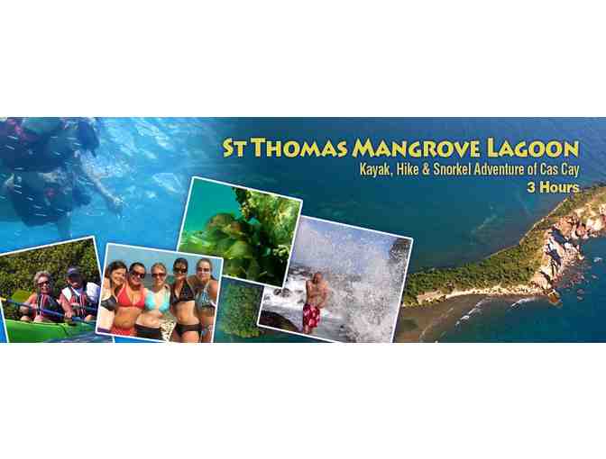 On St. Thomas on this 3 hour tour for 4 people, a unique, multi-eco experience awaits you, as you kayak among the many small islands of the Inner Mangrove lagoon. Stop and learn why the Mangrove Ecosystem plays a crucial role in maintaining healthy offshore coral reefs, reef fish populations, and shoreline stabilization. Hike the pristine, deserted 15 acre island of Cas Cay, in the Virgin Islands Park System. Enjoy many breathtaking views from coral and shell beaches. Explore the mangrove forest, try your luck with a hermit crab race, and hike to tidal pools, volcanic cliffs at the base of volcanic cliffs and marine tidal pools, complete with a rare geologic blow hole. Snorkel a coral-fringed mangrove nursery with easy beach entry snorkel in the clear protected waters.
