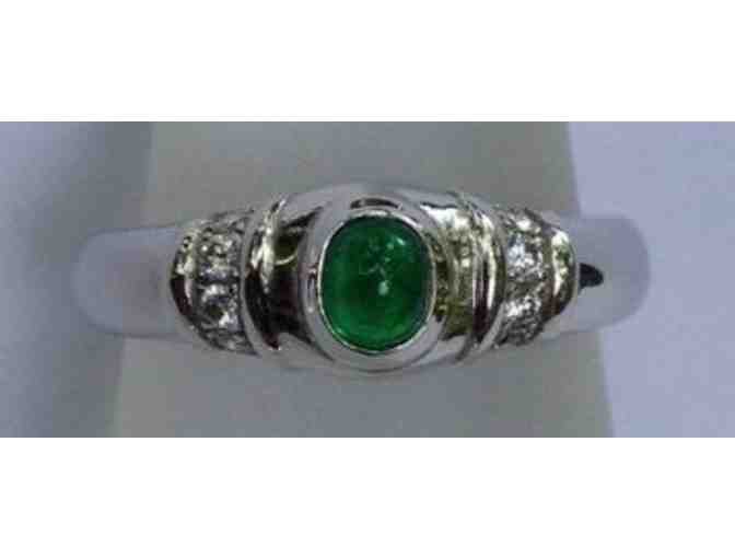 EMERALD CABOCHON, VERY FINE COLOR AND CLARITY, 4 X 3MM EMERALD, 0.12 CTW VS CLARITY DIAMONDS SET IN A PLATINUM RING.