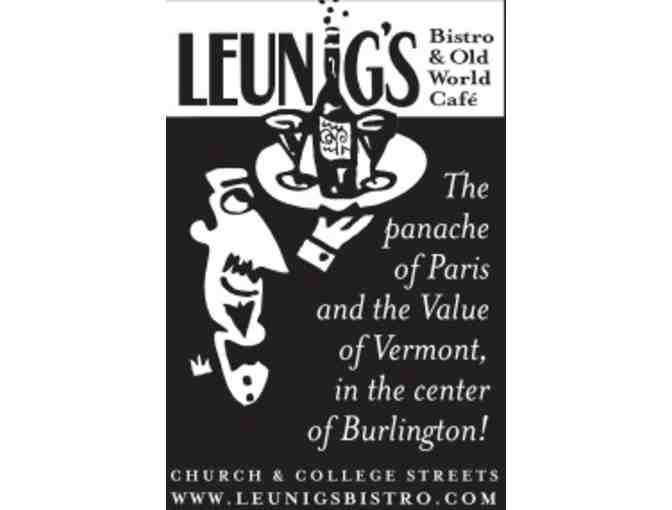 Leunig's Bistro & Cafe is the popular, award winning restaurant bringing the panache of Paris and the value of Vermont into the heart of Downtown Burlington, Vermont. This boisterous, fun place on the pedestrian mall --the Church Street Marketplace-- has a retro old-world flair, with washed walls, a marble bar, crystal chandeliers, and oversized posters. The inventive, large menu features regional foods prepared with a continental touch.